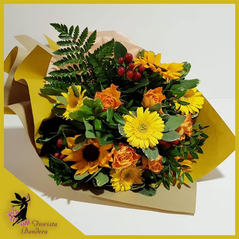 Un bel bouquet allungato di gerbere gialle, girasoli e rose arancioni